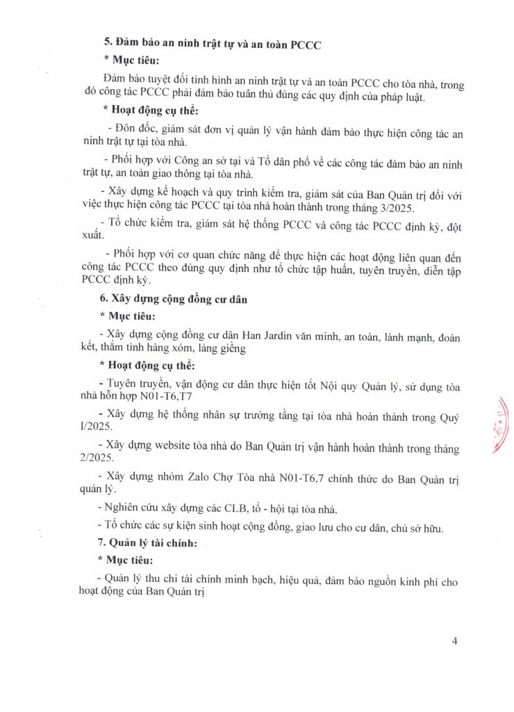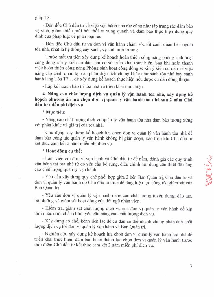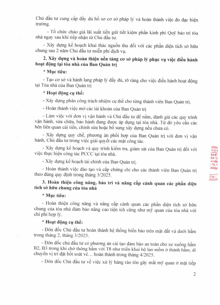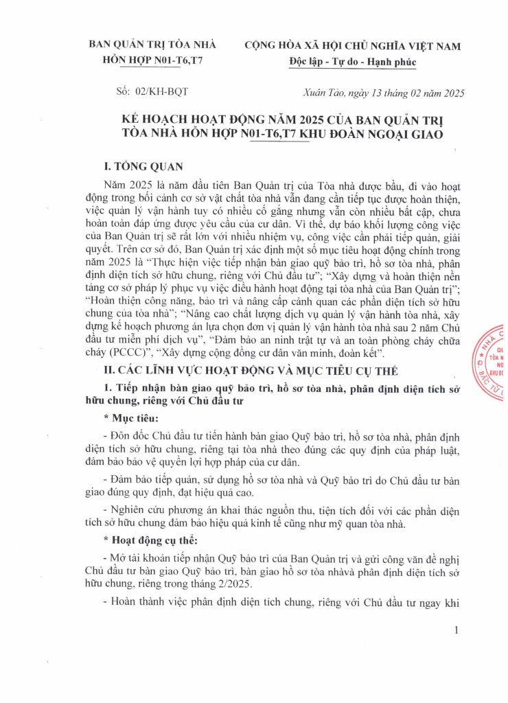 Ban Quản trị xin trân trọng gửi đến cư dân toàn văn Kế hoạch hoạt động năm 2025 của Ban Quản trị tòa nhà. Định kỳ hàng Quý, Ban Quản trị sẽ tiến hành đánh giá về tiến độ thực hiện kế hoạch này để kịp thời điều chỉnh kế hoạch, cũng như giải quyết những vướng mắc bất cập phát sinh. Rất mong nhận được sự giám sát, đồng hành và hỗ trợ của cư dân trong việc triển khai thực hiện Kế hoạch.