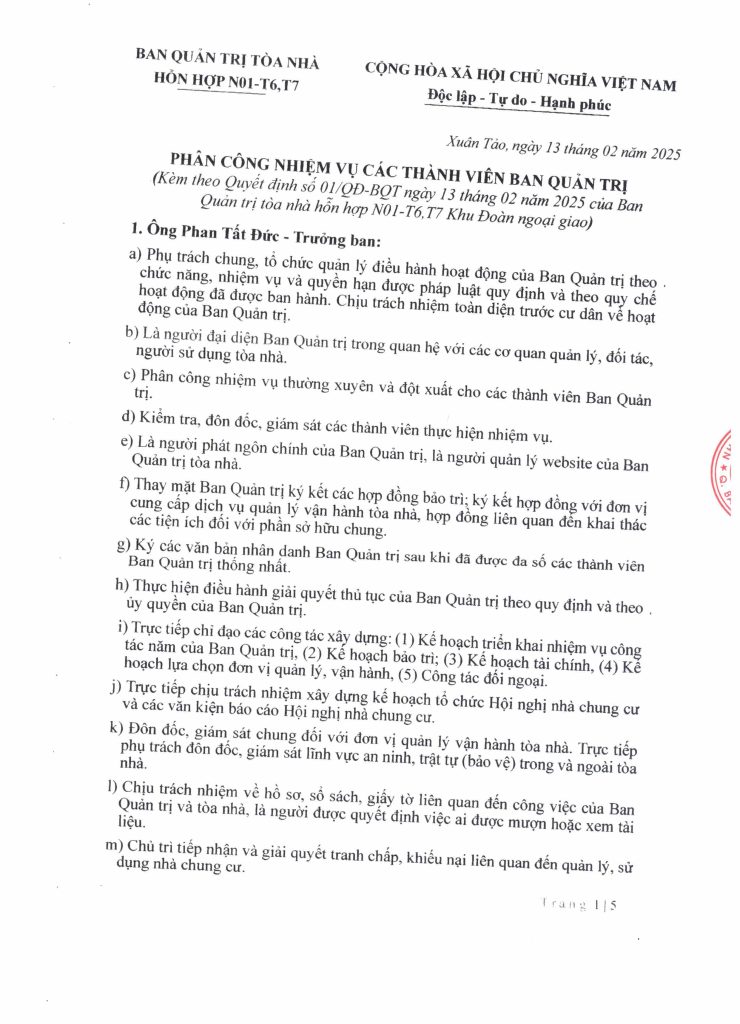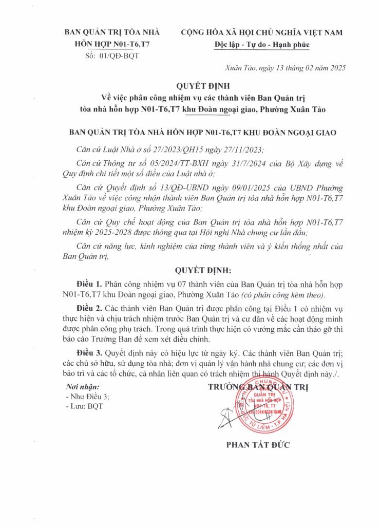 Ngày 13/2/2025, Ban Quản trị Tòa nhà đã tổ chức cuộc họp lần đầu, thống nhất thông qua phân công trách nhiệm từng thành viên Ban Quản trị. Thay mặt Ban Quản trị, Trưởng Ban đã ký Quyết định số 01/QĐ-BQT ngày 13/2/2025 về việc Phân công nhiệm vụ các thành viên Ban Quản trị Tòa nhà hỗn hợp N01-T6,T7, khu Đoàn ngoại giao, Phường Xuân Tảo.