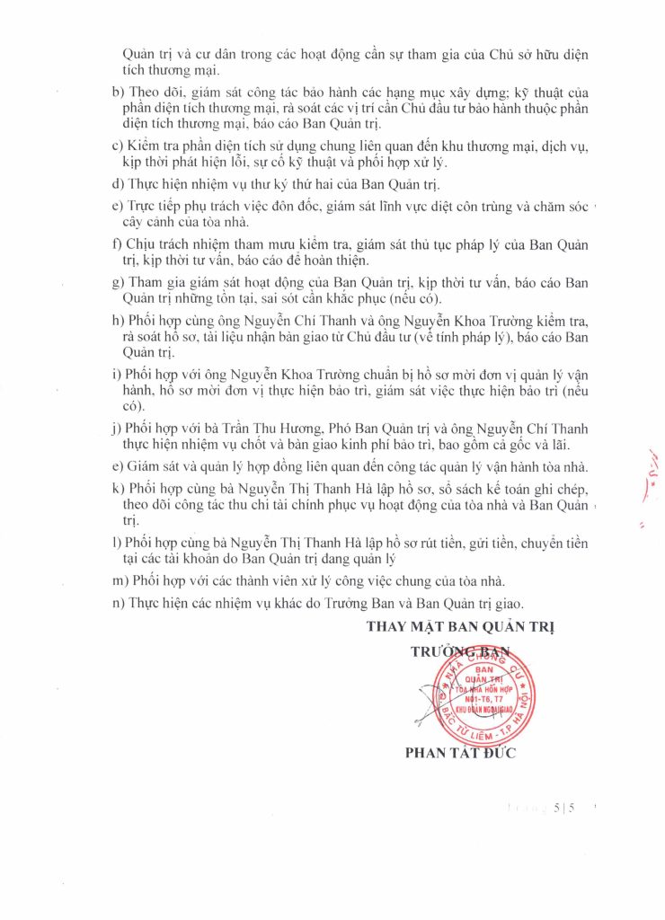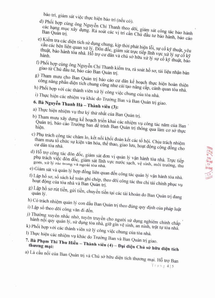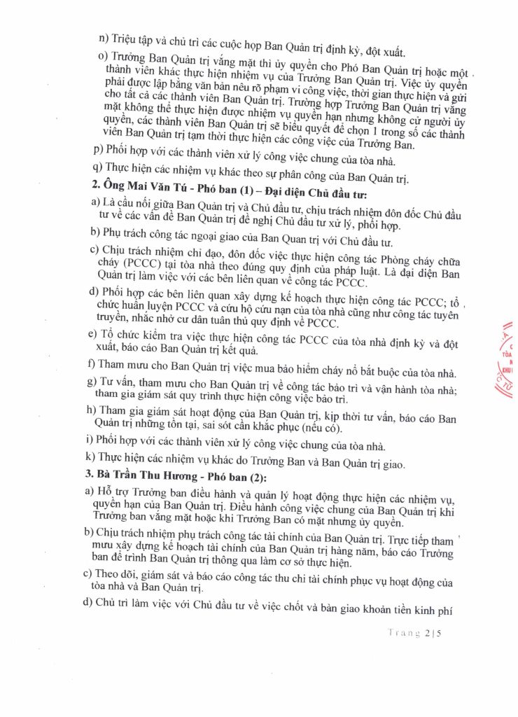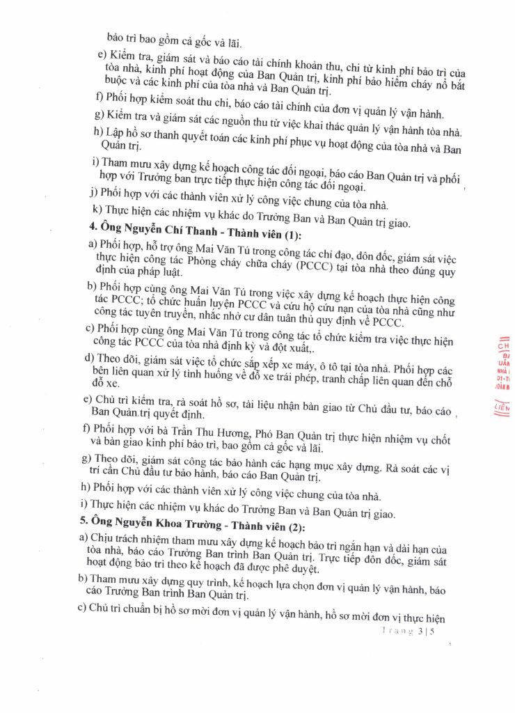 Tóm lược, liên quan đến các mặt đời sống dân sinh của tòa nhà thì từng thành viên Ban Quản trị sẽ trực tiếp phụ trách các lĩnh vực sau: