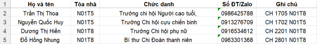 Ngoài ra, Ban Quan trị cũng xin gửi tới cư dân thông tin về Bí thư và Tổ trưởng, Tổ phó Tổ dân phố số 14 để các cư dân có thể liên hệ khi có công việc liên quan