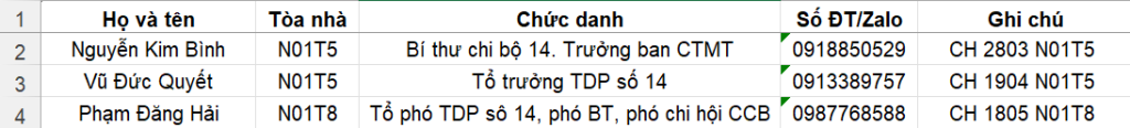 Thông tin liên hệ của Bí thư, Tổ trưởng và Tổ phó Tổ dân phố số 14.